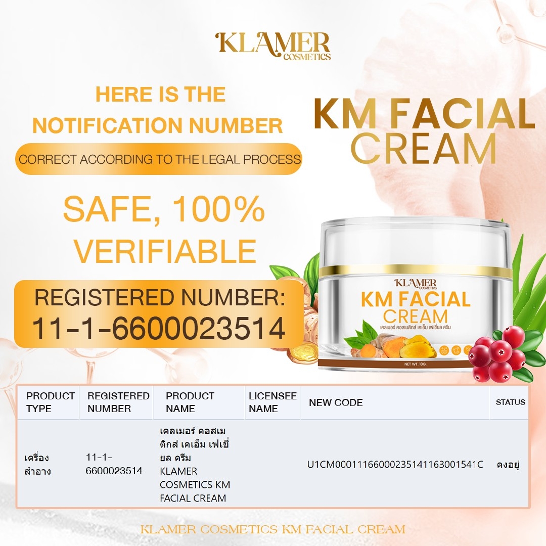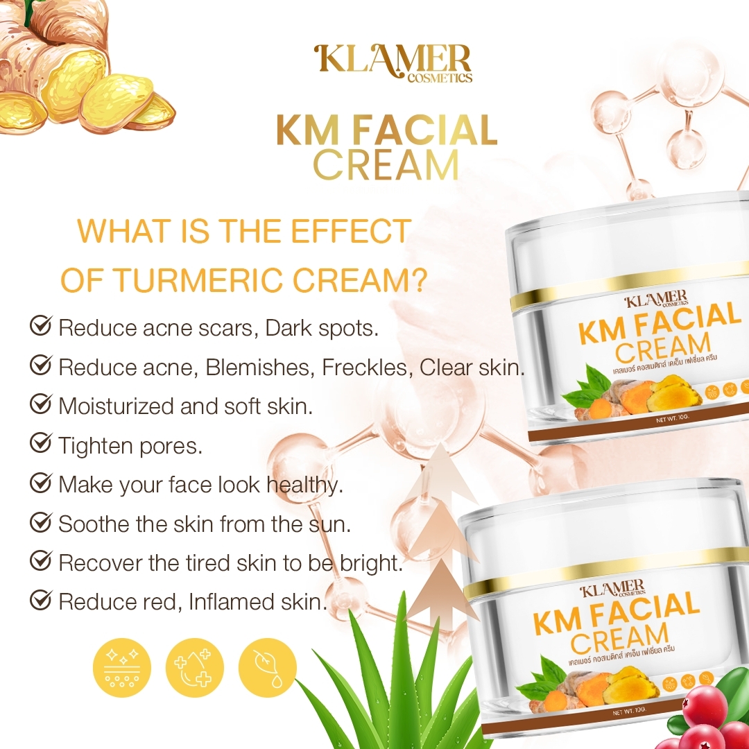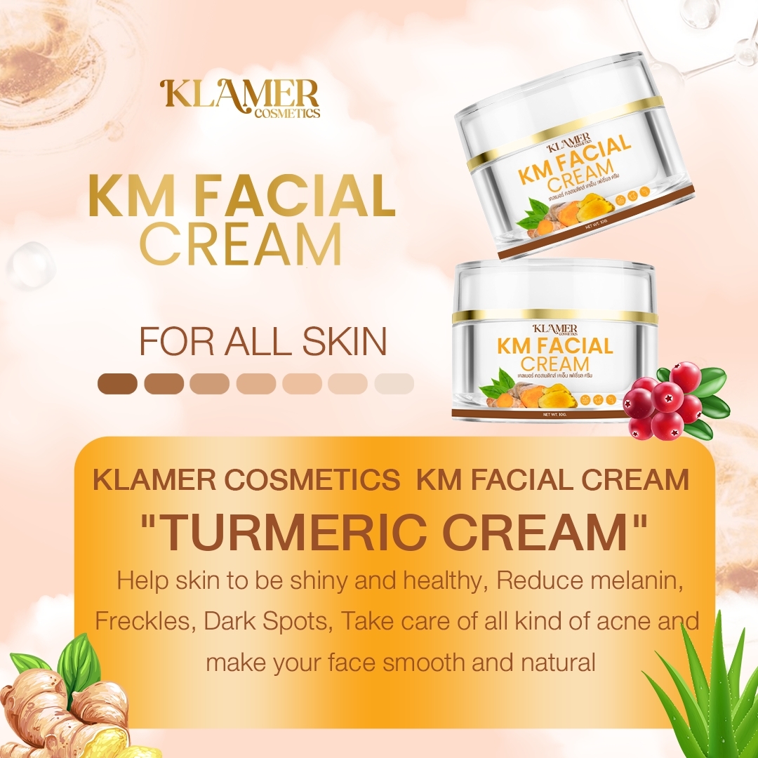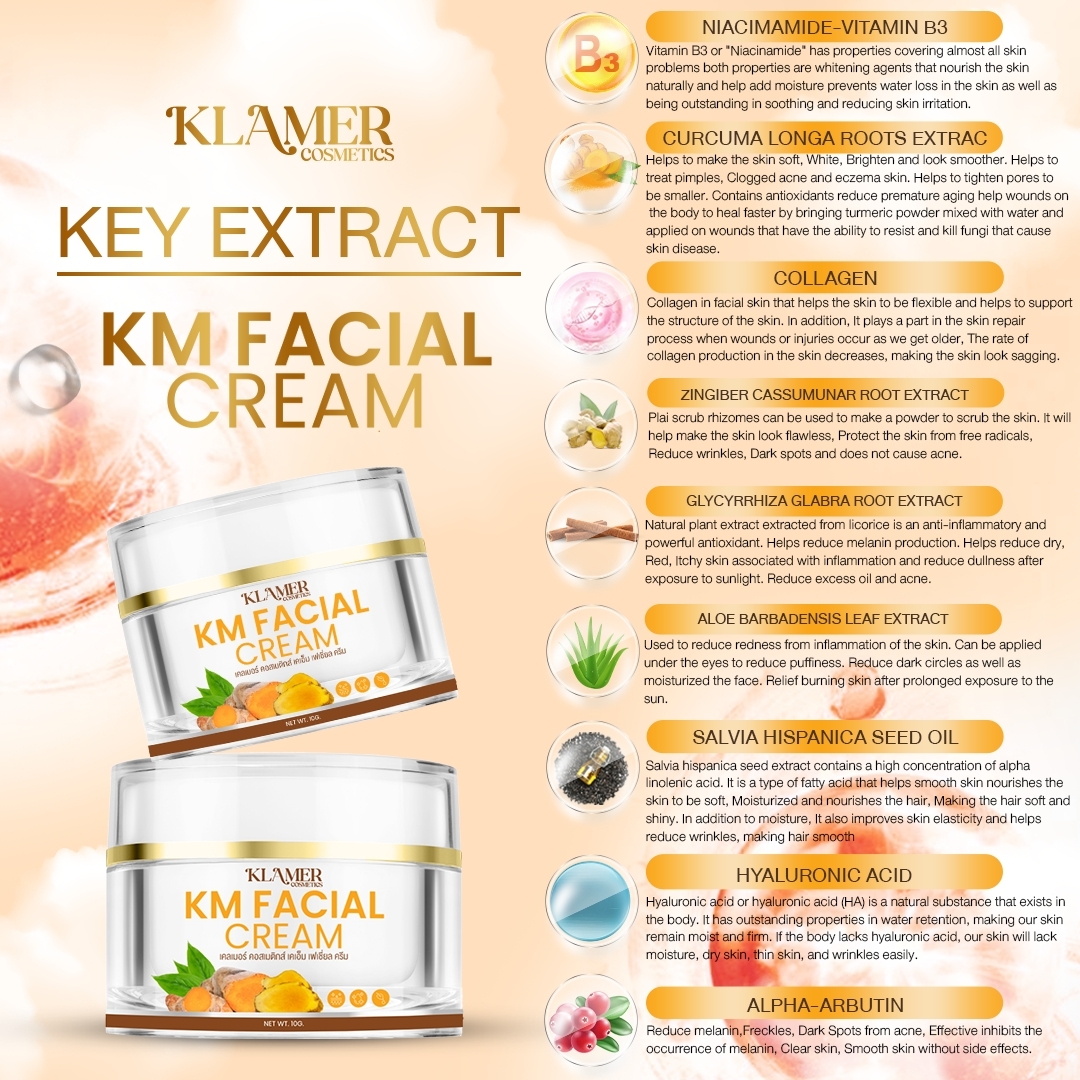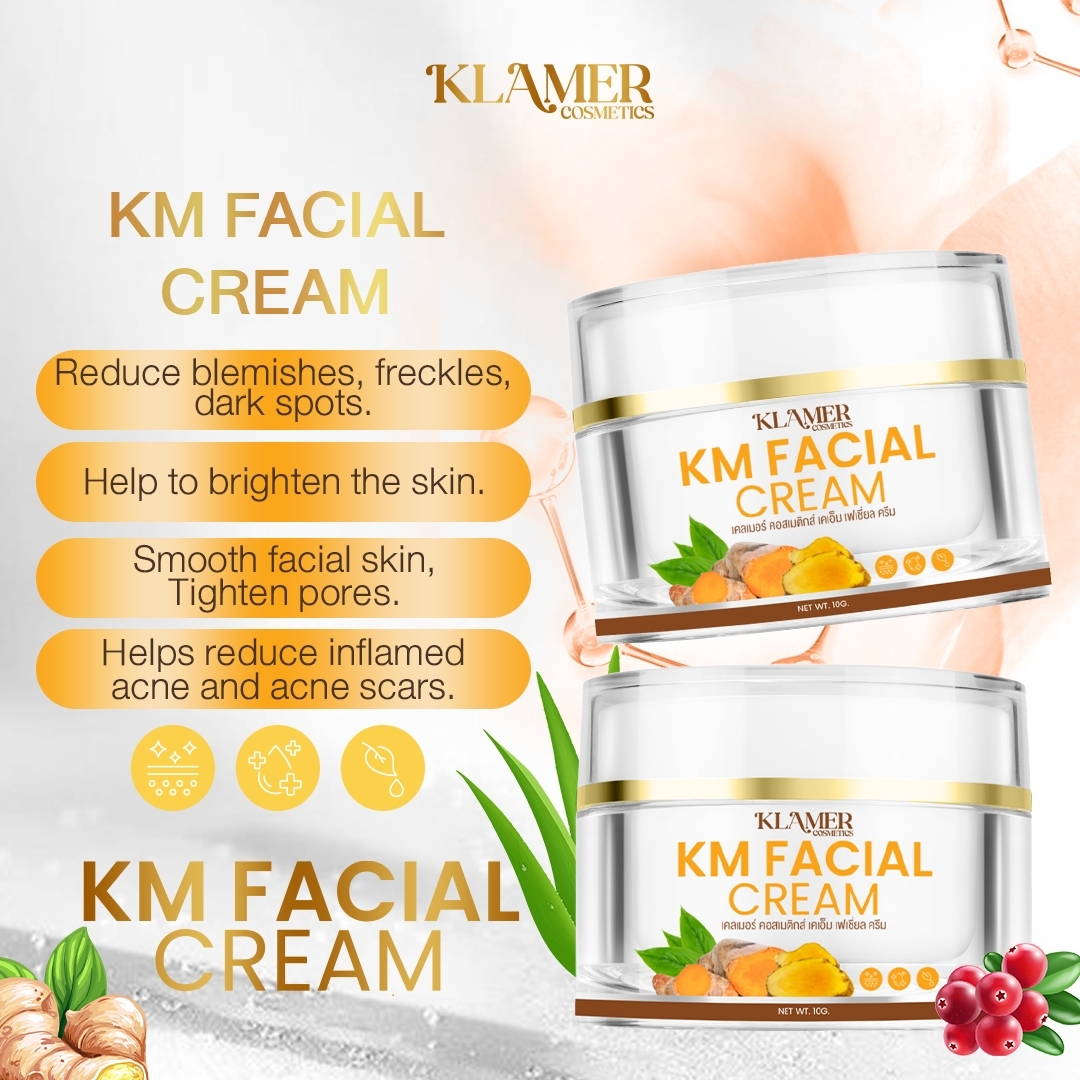 Help to make the skin clear, smooth and healthy. Treat acne, blemishes, freckles and dark spots and make them fade away. KM Facial Cream (Night) are enriched with many natural extracts such as, turmenic extract, phlai extract, licorice extract, aloe vera extract, chia seed oil, etc… and will leave your skin looking smooth and clear in the morning.